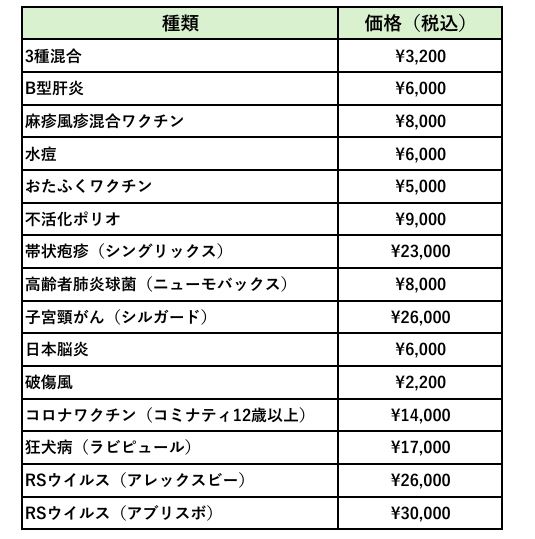 当院では、下記のワクチンを表示価格にて接種いただけます